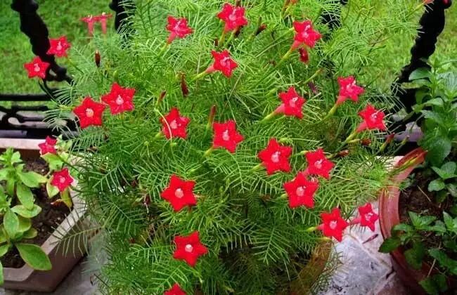 茑罗开出五角星形状的花朵,花期从夏至到深秋,而且生性泼辣,只要保证光照充足就能开花,而且能播自播,播种一年,好多年都能自己长出来。